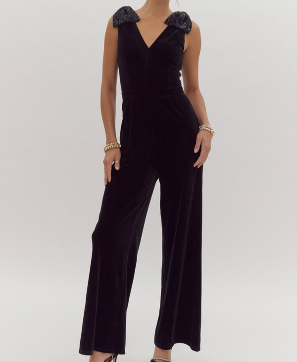 Solid V-Neck Sleeveless Velvet Wide Leg Jumpsuit