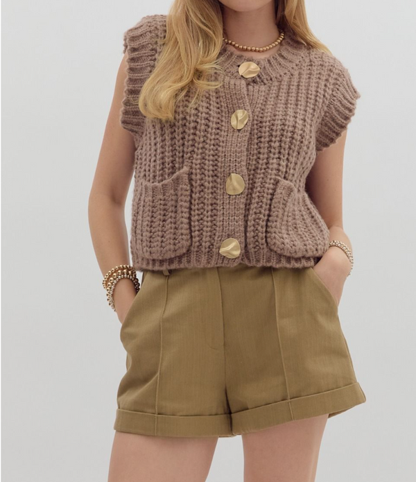 Solid Sweater Knit Sleeveless Vest Top Featuring Gold Button-Mocha Mousse