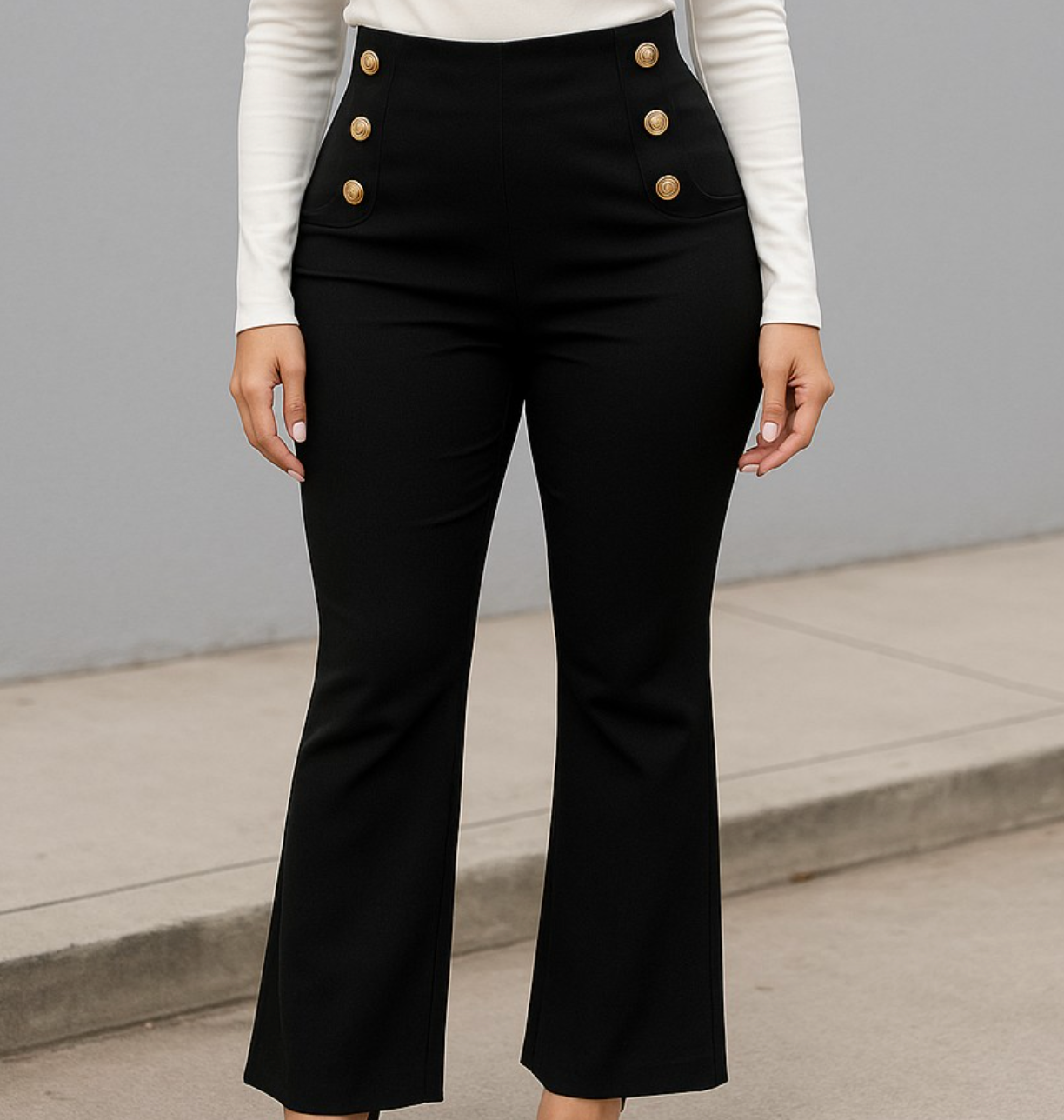 Step out in style with these playful dressy high-rise pants, designed to hug your curves with their stretchy fabric. The high waist offers a flattering fit, while shiny gold button accents add a fun, flirty twist to your outfit. Perfect for mixing comfort with a splash of sparkle!